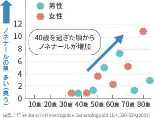 この「ノネナール」という物質は、40歳を過ぎた頃から増加します。「ノネナール」の発生は脂質と酸化が大きく関わっています。