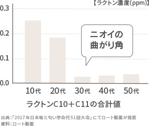 年齢とともに減るといわれているのが、若い女性から発生する甘くていい香りのもとになっている「ラクトン」。30代を境に、ガクッと減少します。