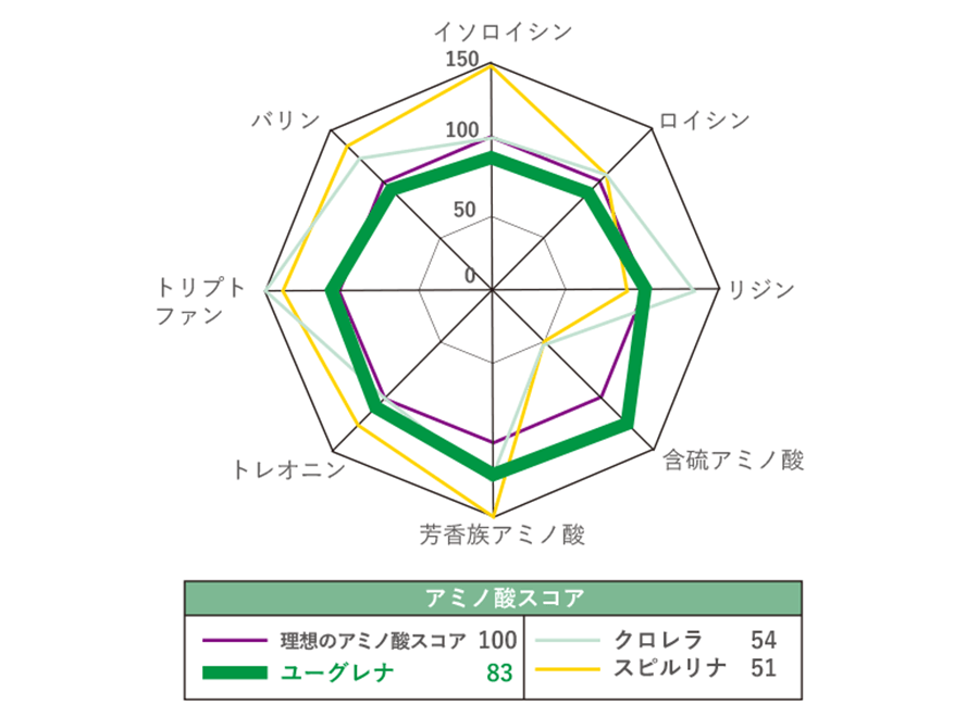 理想値を100とした場合、ユーグレナが「83」という高スコアを叩き出すのに対し、クロレラは「54」、スピルリナは「51」にとどまります。