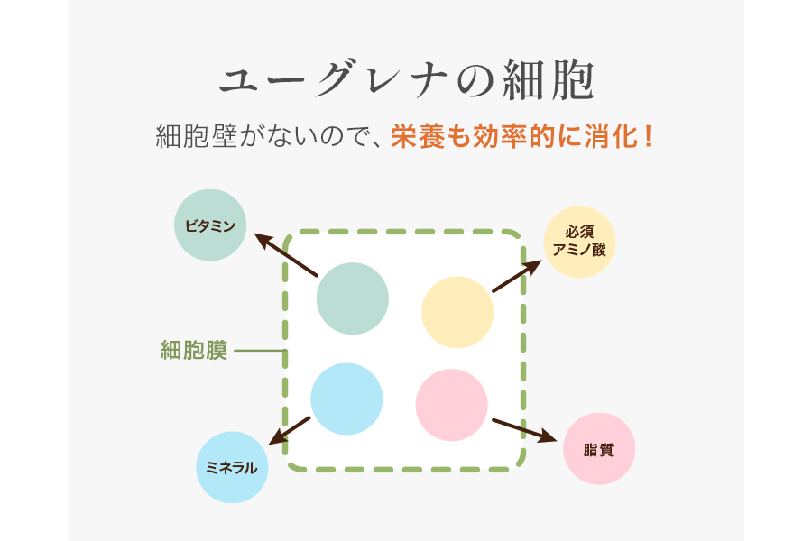 ユーグレナの体を覆っているのは、成分を通しやすい柔らかい「細胞膜」だけです。硬い鎧を脱ぎ捨てたことで、私たちの体は消化酵素の力を使わずとも、ユーグレナの栄養にダイレクトにアクセスすることができます。