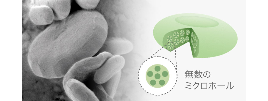 これは食物繊維の一種ですが、その構造は非常に特殊です。表面には無数のミクロの穴が開いており、まるで「炭(すみ)」のような多孔質構造をしています。