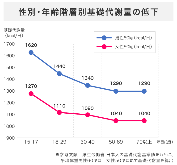 | 参照: | 健康日本21アクション支援システム ~健康づくりサポートネット~ 加齢とエネルギー代謝 |